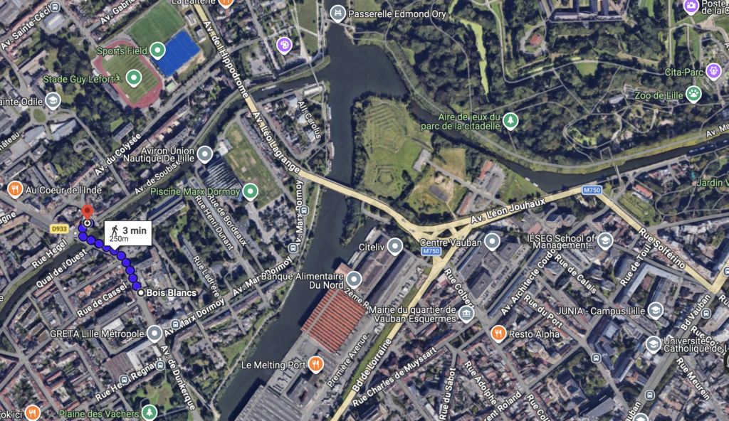 Nous cheminerons ensuite le long du petit bras de la Deule jusqu’à la passerelle Edmond Ory, puis à droite sur l’avenue Matthias Delobel. La première rue à gauche afin de remonter toute l’allée du Train de Loos. A « l’Accro Lille », nous prendrons la voie de droite, puis passerons devant une pierre taillée indiquant « à Boufflers, aux combattants de 1709 ». Ensuite, nous longerons l’entrée de la Citadelle, passerons la première ceinture de fortifications pour emprunter à gauche le chemin du combattant. Il entoure au plus près la Citadelle.